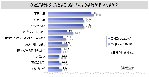 昼食を外食する場面は(複数回答)、「平日の昼」が外食をする人の46.5%、「休日の昼」「外出のついで」が各4割弱です。2018年調査と比べて、「遊びに行く・レジャー」「友人・知人と会う」は減少しています。「平日の昼」は高年代層、「休日の昼」は若年層、「外出のついで」「友人・知人と会う」は女性で比率が高くなっています。