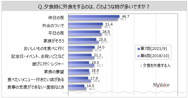 夕食を外食する場面は(複数回答)、「休日の夜」が外食をする人の46.7%、「外出のついで」が31.4%、「平日の夜」「家族がそろう」などが各20%台です。「休日の夜」は10~40代、「記念日・イベント、お祝いごとなど」は女性で比率が高くなっています。