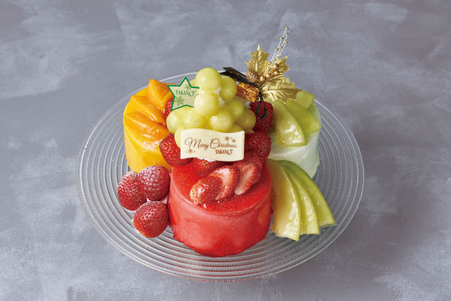苺、マンゴー、メロンの3種類のケーキにフルーツを飾ったアソートケーキ。