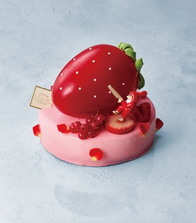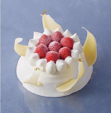 粉雪をまとった花に見立てた、口あたりのやさしいケーキ。チェリーリキュールで香りづけした苺を使用して