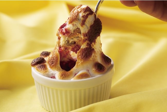 カスタードクリーム、チーズケーキ、ラズベリーソース、マシュマロを層にした、食後におすすめのスイーツです。ラズベリーソースの酸味がアクセントになっています。ライブキッチンで出来立てをご用意いたします。とろけるマシュマロの甘い香りと共に、酸味と甘味のハーモニーをお楽しみください。