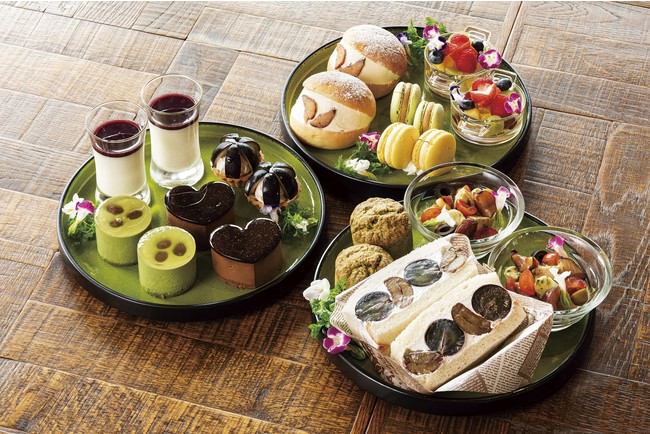 下段には、抹茶のスコーンや、ぶどうと渋皮甘栗をクリームでサンドした、ボリューム満点のサンドイッチ をお楽しみいただけます。
