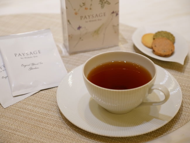 日本の軟水にあわせた最適なブレンドを展開する紅茶ブランド『Les Feuilles Bleues(フィーユ・ブルー)」のPAYSAGEオリジナルブレンドティー <Garden>は、パティシエ江藤英樹が幼少時に過ごしたロンドンの王立植物園での散策や、郊外での花と緑にまつわる思い出を受け、 初夏の英国の風景や空気感を感じる風味を作り上げました。セイロン、アッサム、ダージリン、キームン、ケニアといった複数産地の茶葉を採用し、穏やかながら風味に芯のあるフレーバーとなっています。PAYSAGEのお菓子と相性を考え調合しました。