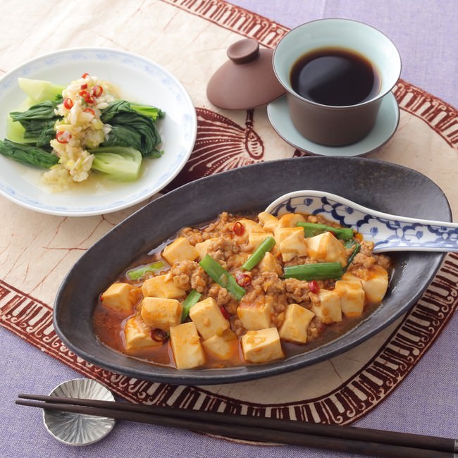 副菜は、麻婆豆腐の柔らかな食感とは対照的にしっかりとかみごたえがあり、不足しがちな緑黄色野菜、青梗菜を合わせました。麻婆豆腐の辛味を和らげる甘酸っぱいタレに仕上げています。2つのレシピは、共通の食材(長ねぎ、生姜、にんにく)を使い、切り方を揃えることで、同時に下準備ができる時短メニューになっています。