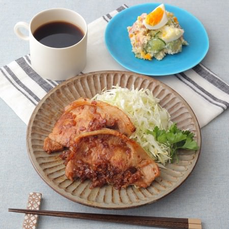 食欲をそそる玉ねぎソースがたっぷりの生姜焼きに、王道の相性であるポテトサラダを合わせました。ロース生姜焼きの甘辛い味わいに、厚切りベーコンと半熟卵のボリュームをヨーグルトとレモンでさっぱりと食べられるポテトサラダを組み合わせています。豚肉やベーコン、卵のタンパク質、キャベツやじゃがいも食物繊維、じゃがいもの糖質を合わせて、ご飯のおかずとしても、おつまみとしても栄養バランスが整うメニューです。