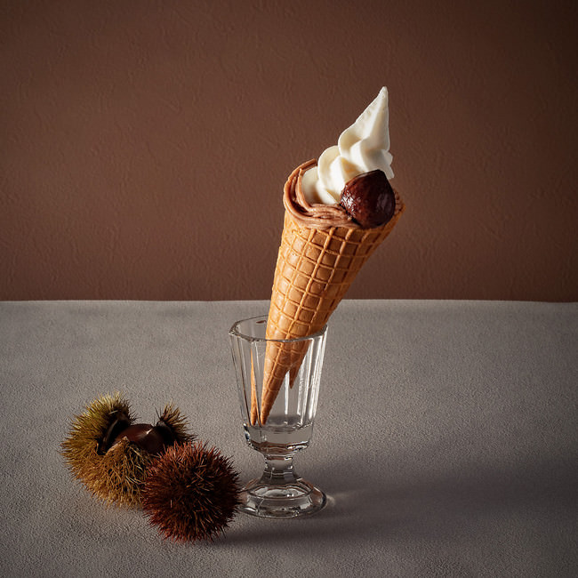 モンブランクレープと同様フランス産マロンクリームを使用したソフトクリーム。ミルクの味わいが芳醇なリッチミルクソフトクリームをベースに、マロンクリームを飾り付け、甘く煮た栗をトッピングしました。
