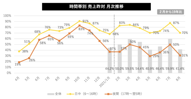 8月の時間帯ごとの内訳も日中/夜間とも先月から約ー20ptの落込みとなった。酒類提供禁止による夜間の落ち込みだけではなく、感染者数増加による消費者の外食控えが日中/夜間ともに大きく影響を及ぼした結果とみられる。