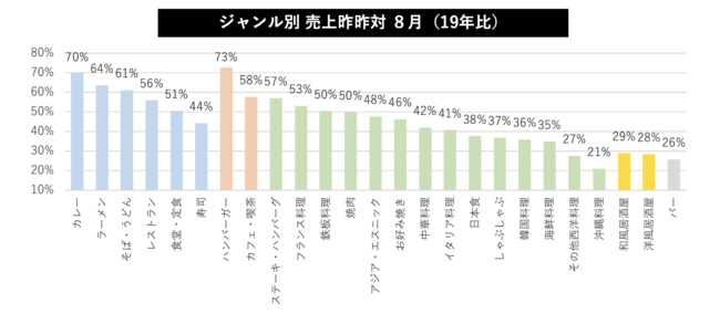 8月はテイクアウトに強いカレー、ハンバーガージャンルがコロナ禍前比70%だった以外は各ジャンル落ち込みが大きく表れた。専門料理の中では先月トップだった焼肉が4番目に落ちているのは、焼肉ジャンルの「回復期には強くて自粛時には影響を受けやすい」特徴が出ていると考えられる。