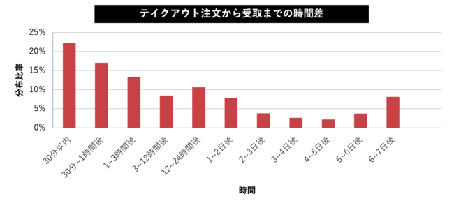 約40%が1時間以内の受け取り、とやはり「スピード」をユーザーが求めていることがみえてくる。一方で日にちをまたいだ注文が30%程度あるのも特徴的なデータで事前に意思決定をしているユーザーが一定数存在する。