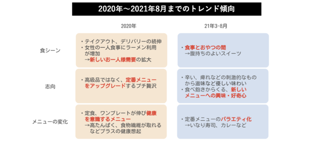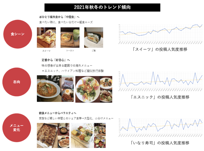 グルメコミュニティアプリ「SARAH」に投稿された80万件以上のメニュー単位の外食データをベースとした外食トレンドを分析するサービス「FoodDataBank」ではコロナ禍における2020年以降の動向を踏まえ、2021年秋冬トレンドを下記のように分析する。