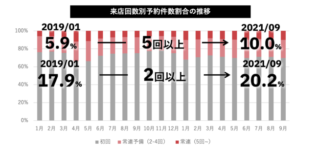 コロナ直前の2020年1-2月の5回以上来店している割合が5.9%に対し、直近の割合は9.96%まで上昇。GoToEatによる駆け込み需要が起こった昨年10~11月にリピーター率は2020年以前の数値まで戻ったが、ポイント獲得目的の常連客の一部がグルメサイト経由で予約をしたため、期間中一時的に増加したと考えられる。キャンペーン後は、堅調にリピーター率は増加。予約数が少ない時に常連客の割合が多くなる傾向があるため、苦しい時に常連客を確保している店舗はしのぎやすいと言える。複数店舗を運営している場合、系列店舗内で顧客を共有し活用することも有効な施策だと考えられる。