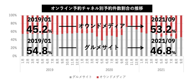 グルメサイトからの予約とオウンドメディア(自社公式ウェブ)予約の割合がコロナ禍逆転し、グルメサイトが45%程度、自社予約ページが55%になっている。GoToEat期間はグルメサイト予約が急増したが、現在の数値を見ると明らかに飲食店の予約チャネルに対する意識は変化しつつあることが分かる。オウンドメディア予約URLに紐づけられるInstagramやGoogle Mapからの予約が増えていることからも、飲食店側がグルメサイトの送客手数料に対してシビアになっているか、グルメサイトがコストに見合った送客をできていない可能性も考えられる。