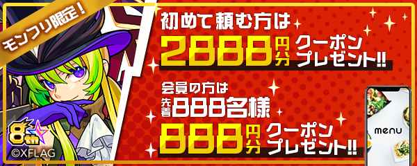 「モンスト」ユーザーに8周年を記念したクーポンをプレゼント。 menuを初めてご利用されるお客様には初回限定の2,400円分クーポン、すでにmenuを利用されている方には先着6000名様に「8周年」にかけた、888円分のクーポンとなります。