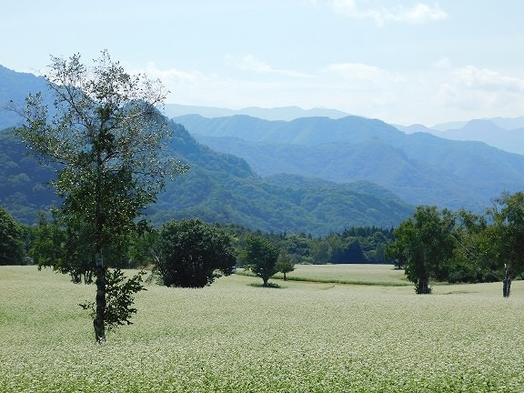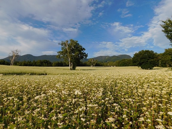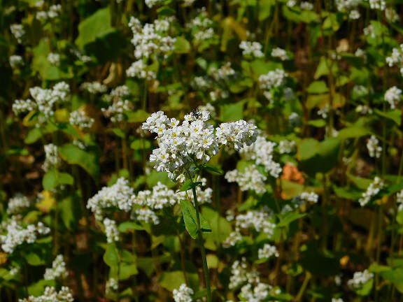 左・中央:満開のそば畑 右:そばの花(福島県南会津町たかつえそば畑)
