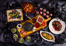 冷製竹炭そば もみじおろし、ベルローズと刻みのり |スプーキーハロウィーンサラダ、アンチョビドレッシング ワイルドライス、ザクロ、焼きスナップエンドウとグラナパダーノ|カボチャのローストとレンズ豆のサラダ メープル、スモークパプリカとネギ |クランベリーとザクロのブルスケッタ クリームチーズ、生姜、ハチミツとミント|モンスターパンプキントースト チーズ、ブラックオリーブとトマト|ベーコンと玉葱のタルト、バルサミコ風味の野菜と共に パプリカ、茄子とレーズン