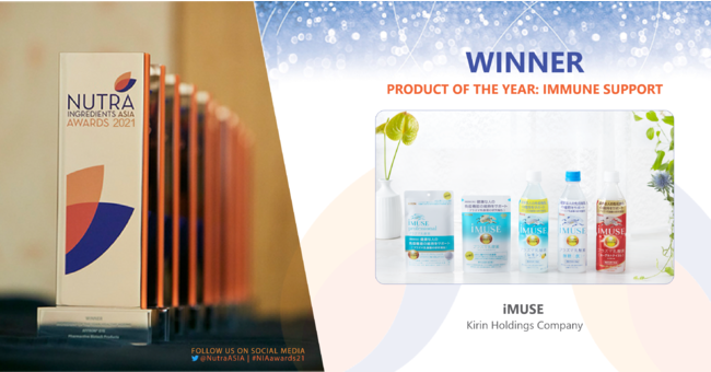 キリンホールディングス株式会社(社長 磯崎功典)が発売する、キリンの独自素材「プラズマ乳酸菌」を配合した「iMUSE」ブランドは、世界で食品・飲料・栄養業界向けのニュースレター、出版物、データソースを多数発行しているWilliam Reed Business Media社が主催する「Nutralngredients-Asia Awards」(https://nutraingredientsasia-awards.com/live/en/page/home) で新設された「免疫サポート」部門において、2021年度「プロダクト・オブ・ザ・イヤー」を9月8日(水)に受賞しました。