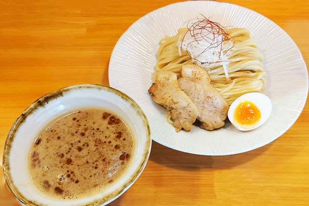 濃厚魚介スープにスパイスを混ぜ、自家製ラー油を配合。麺は歯ごたえある太麺で、スパイスを練り込み、茹でている最中から香りが広がります。後入れのチリパウダーで辛さの調整も可能です。濃厚なスープとスパイス麺がマッチする他にはない味わいです。