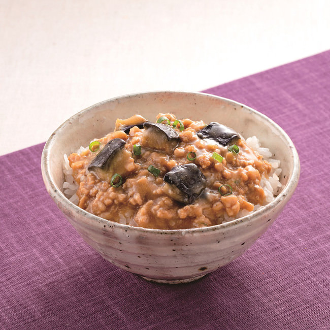 歯応えの良い国産豚肉のそぼろをほんのり甘辛く味付けし、揚げなすと合わせました。
