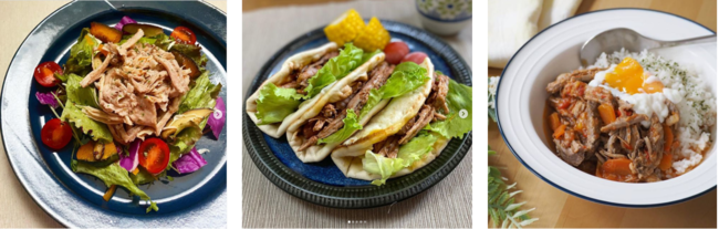 「プルドポーク」はアメリカやカナダなど、北米で親しまれている家庭料理です。オーブンで焼いたり、お鍋で煮込んで柔らかくした大きなかたまり肉をフォークなどで裂いて(プルして)楽しみます。北米ではBBQの定番として人気ですが、当社ではサラダやカレー、丼といった和食までさまざまな料理で楽しめるレシピとして提案をしています。