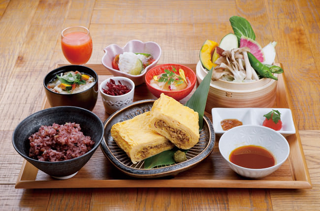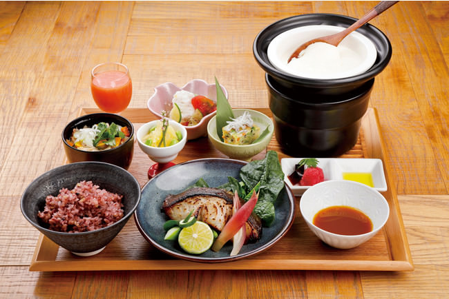 一六茶寮の定食は、新鮮な野菜をそのままジュースにした食前メニュー「グリーンジュース」に、国産白味噌で熟成させた「西京味噌焼き」など、主菜と小鉢3種、十六穀米のご飯、豚汁が付き、さらに北海道産の大豆を使用した豆乳と塩田にがりで仕立てた「土鍋おぼろ豆ふ」か、素材の旨味を活かした「野菜せいろ蒸し」のどちらかをお選びいただける「一汁六菜」。