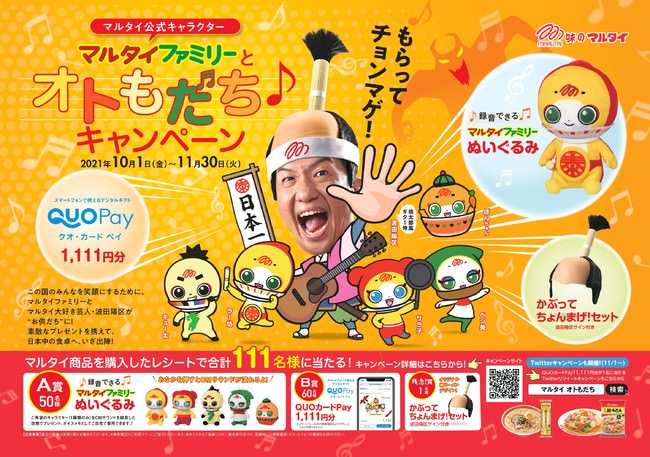 (A賞:録音できる!マルタイファミリーぬいぐるみ/B賞:QUOカードPay 1,111円分/残念!賞:かぶって