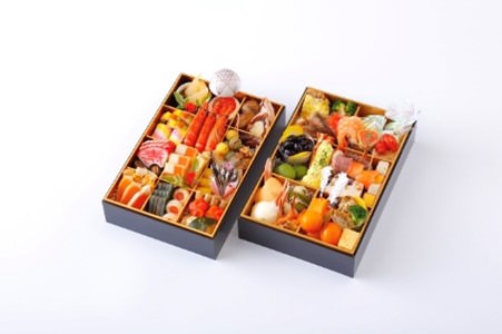 [一ノ段] 祝鯛姿焼き/有頭海老の旨煮/鮑の酒蒸し/黒毛和牛のロースト/かずのこ/鰤の柚庵焼き/烏賊の印籠焼き/菊花蕪/いくら醤油漬け/キャビア/金柑の甘露煮/昆布巻き/金箔黒豆[二ノ段] 鴨ロース有馬山椒煮/オリーブとサラミのピンチョス/自家製ミートローフ/南瓜寄せクリームチーズ/ズワイガニ酢/小肌粟漬け/生ハムクリームチーズ/タコの柔らか煮/コーンビーフ