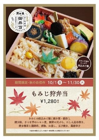 濱田屋では同じく10月1日(金)より、期間限定で秋の自信作「もみじ狩り弁当」を販売開始します。販売から15年と続くロングセラーの商品で、だしの効いた茸たっぷりの炊き込みご飯と、旬の食材をふんだんに盛り込んだ、里山の雰囲気を感じる秋の人弁当となっております。