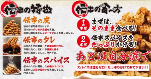 1)登録商標!新時代の名物!日本一のパリモチ鶏皮串「伝串」
