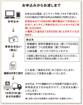 なお、新型コロナウイルス感染拡大防止対策として、ご予約、お支払い、お届けにいたるまで、ホテルにお越しにならずにお手元にお届けできるよう、お支払いを銀行振込またはオンライン決済に、おせちのお渡しを全てヤマト運輸のクール宅急便でのお届けといたしました。