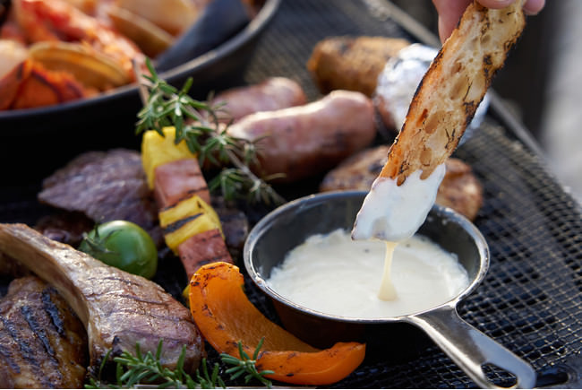 ▲こんがり焼いたバゲットを熱々のチーズフォンデュにディップして