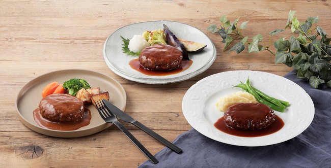 今回販売する新ハンバーグ3品は、国産の黒毛和牛と黒豚の素材の良さを最大限に引き出す独自の比率で配合しています。黒毛和牛と黒豚の肉の挽き方の工夫で、噛み応えのある食感と肉の旨みが強く感じられるのが特徴で、しっかりとした肉質をお楽しみいただけます。ソースは、大人からお子様まで味わえる「てりやきソース」、香味野菜やグラスドビアンなどでつくる「洋食ドミグラスソース」、ドミグラスソースをベースにバターと生クリームなどを使った「ブラウンバターソース」の3種類をご用意。湯煎で温めるだけの簡単調理で、シェフこだわりの食感と味をそのままお楽しみいただけます。