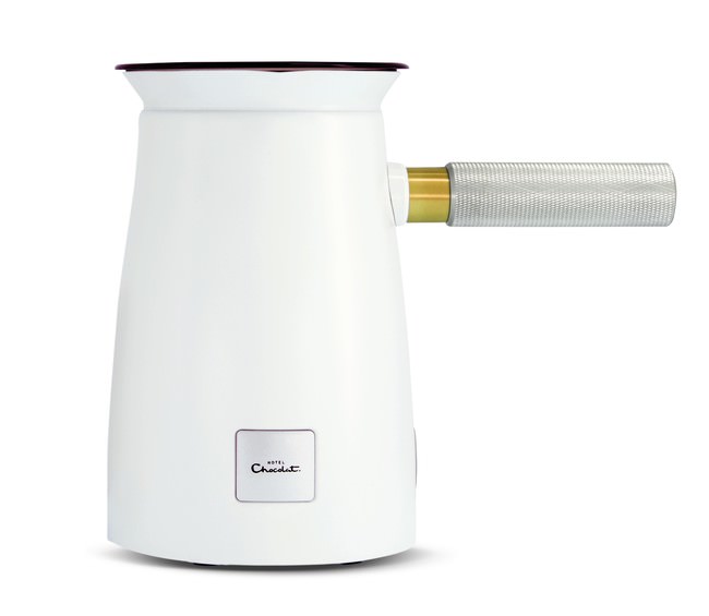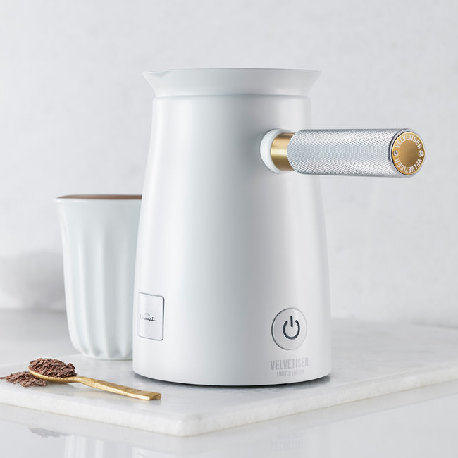 イギリスの家電メーカーDualit(デュアリット)社と共同開発された『ベルべタイザー』は、専用チョコレートフレークとミルクを入れてスイッチを押すだけの簡単操作、約2分半でショコラドリンクが出来上がります。ホットショコラだけでなく、アイスショコラドリンクやチョコレートムース、チョコレートソースなどのアレンジメニューも簡単にお楽しみいただけます。