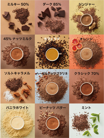 ミルキー50%からダーク100%までカカオの含有率で選んだり、ソルトキャラメルやミントなどのお気に入りのフレーバーを楽しんだり。さらにコーヒーとのマリアージュを楽しむカフェラテも。14種類(2021年10月8日現在)のバリエーションからお好みのフレーバーを見つけ出す楽しみを味わえます。ご自宅にいながらカフェのような気分で、本格的なショコラドリンクをぜひお楽しみ下さい。