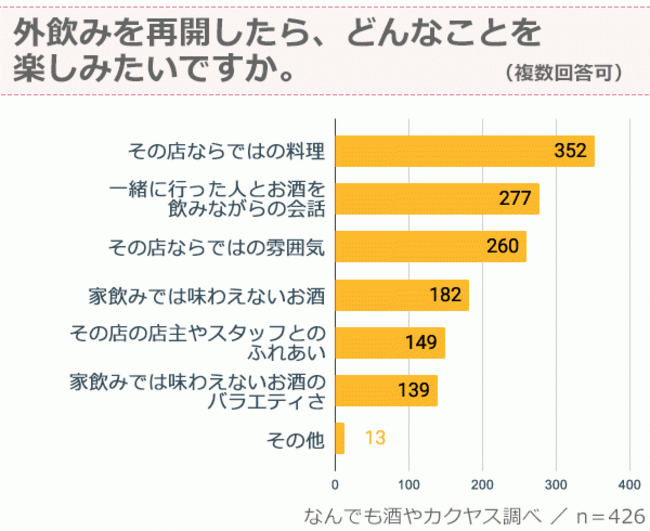 今後、外飲みを再開したら、お酒好きの人たちはどんなことを楽しみたいのでしょうか。圧倒的に多かったのは「その店ならではの料理」でした。次いで「一緒に行った人とお酒を飲みながらの会話」「その店ならではの雰囲気」、そして「家飲みでは味わえないお酒」と続きます。