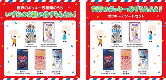 キャンペーンを実施しているスーパーやドラッグストア等で、ポッキーやプリッツを購入し、WEBまたはハガキで購入レシートを使用して応募すると、抽選で世界のポッキー5種類と日本のポッキーとプリッツに加え、世界を旅するポッキーすごろくが付いたセットが当たります。*