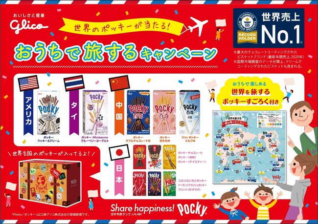 外出自粛やソーシャルディスタンスを余儀なくされる中、おうちの中で少しでも旅行気分を味わい、楽しい時間を過ごしてほしいという思いから、ギネス世界記録の認定を記念して、AmazonとLOHACOで「世界のポッキーの景品付きセット」を販売します。また、「世界のポッキーが当たる!おうちで旅するキャンペーン」を一部のスーパーやドラッグストア等で10月下旬ごろから実施します*²。普段日本国内ではなかなか出会えない、アメリカや中国、タイで販売されている様々な味わいの「Pocky」をお楽しみください。