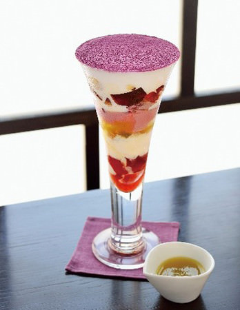 紫芋のティラミス、金時芋の甘露煮、林檎のグラニテと、秋の味覚がつまった逸品。自家製紅茶ゼリーにお芋の甘味と林檎の酸味が絶妙なマリアージュとなっております。