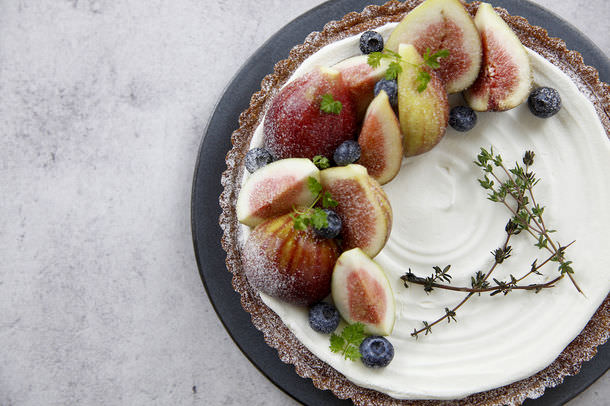 米粉のタルトにカスタード・米粉のスポンジ・ピスタチオクリームを重ねた旬のいちじくタルト。