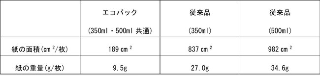 ■表1:「エコパック」と従来品が使用する紙の面積と重量の比較