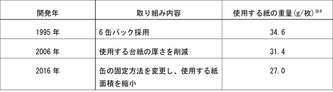 ■表2:アサヒビールにおける6缶パック軽量化への取り組み(350ml缶用)