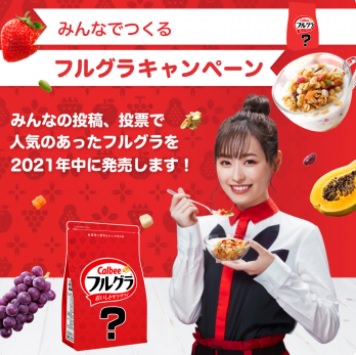 「フルグラ®」の誕生30周年を記念し、これまでのご愛顧に感謝してファンの皆様の投稿、投票で選ばれた商品を開発、発売するキャンペーンです。2020年10月からスタートし、グラノーラの生地やトッピングの募集、オンライン試食会、パッケージ案の募集、販促物のキャッチコピーの募集など、開発から発売までをファンの皆様とコミュニケーションしながら行ってきました。