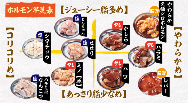 全国から産地を厳選し問屋から直接買付した新鮮な国産ホルモンを330円(税込363円)~400円(税込440円)で提供しております。特製のホルモン早見表をご覧いただきながら、お好みに応じたホルモンをお選びくださいませ。