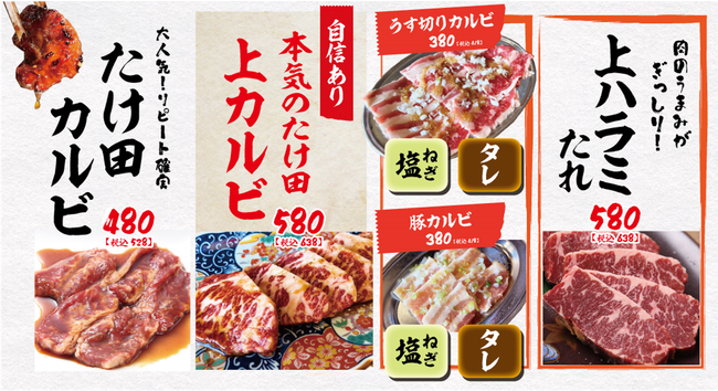 また、その時々に最も質の良い肉を厳選して仕入た「本気のたけ田 上カルビ」580円(税込638円)や、霜降りのサシが入った和牛メニュー680円(税込748円)等、当店では高価格帯の商品も取り揃えておりますので、舌の肥えた食通達も魅了しております。