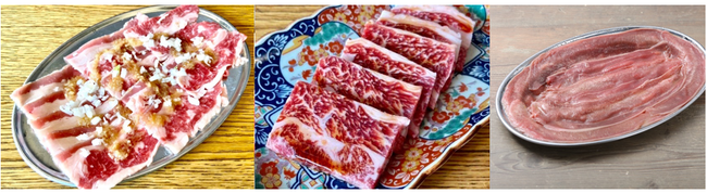 左から:破格の「薄切りカルビ」380円(税込418円)、肉質No1「本気のたけ田 上カルビ」580円(税込638円)、味・ボリューム・価格を兼ね備えた人気の「なが~いタン【豚】」380円(税込418円)