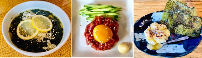 左から:和風出しが味の決め手である、新名物「黒冷麵」480円(税込528円)、人気の高い「さくらユッケ」780円(税込858円)、ビジュアルにもこだわった「焼肉屋の炙りチーズポテサラ」380円(税込418円)
