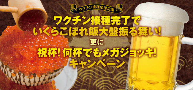 今回、ワクチン接種証明書をご提示いただいた方先着100名様に、道南農林水産部の大人気商品である「いくらこぼれ飯」を無料でプレゼントいたします。さらに、宣言解除の祝杯として、2021年10月18日(月)~11月16日(火)の期間限定で、ドリンクを通常ジョッキ約2倍サイズの「メガジョッキ」にて提供いたします。