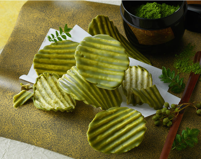 抹茶と和歌山県産ぶどう山椒をまぶしたポテトチップの片面に、宇治抹茶のチョコレートをコーティングしました。口に入れた瞬間にピリッとさわやかに広がる山椒と、ポテトチップの塩味、抹茶チョコレートのほろ苦いコクと甘さがクセになる味わいです。