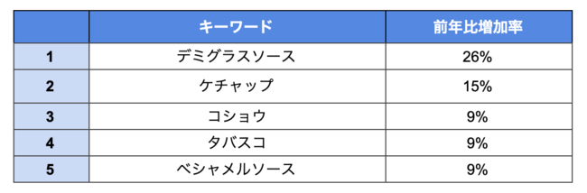 去年の投稿数と比較し、ピラフの調味料に対しての注目が集まっています。トンカツ・ハンバーグをのせて食べるトルコライス風の食べ方が支持されたことにより、デミグラスソースやケチャップなどの調味料への注目度が上昇したようです。