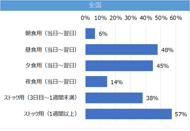 レトルト食品の購入目的に関しては95%の人がコロナ禍でのステイホームや、災害などの予期せぬ出来事に備えたストック用として購入しており、長期保存が可能なレトルト食品の需要を表しています。