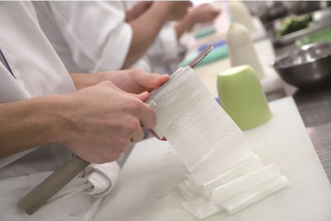日本料理の授業では大根の桂むきの実習で残った大根の芯や根先、葉の部分が。西洋料理ではブイヤベース、その他コンソメやブイヨン(だし類)の調理で、セロリの葉や人参のヘタが残ることがあります。